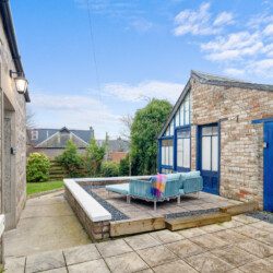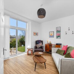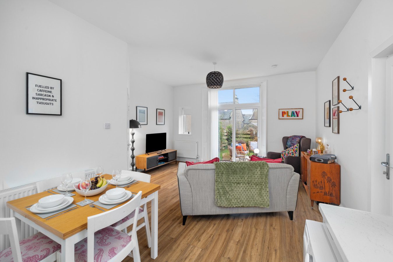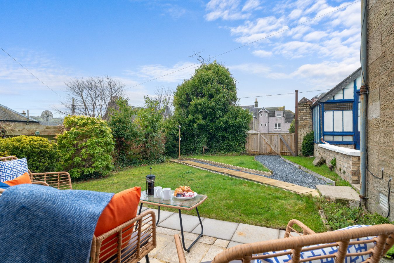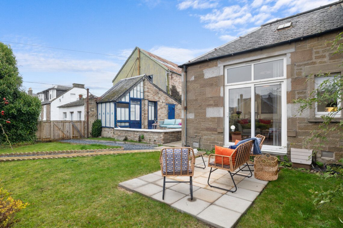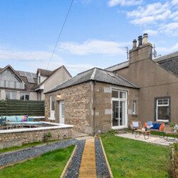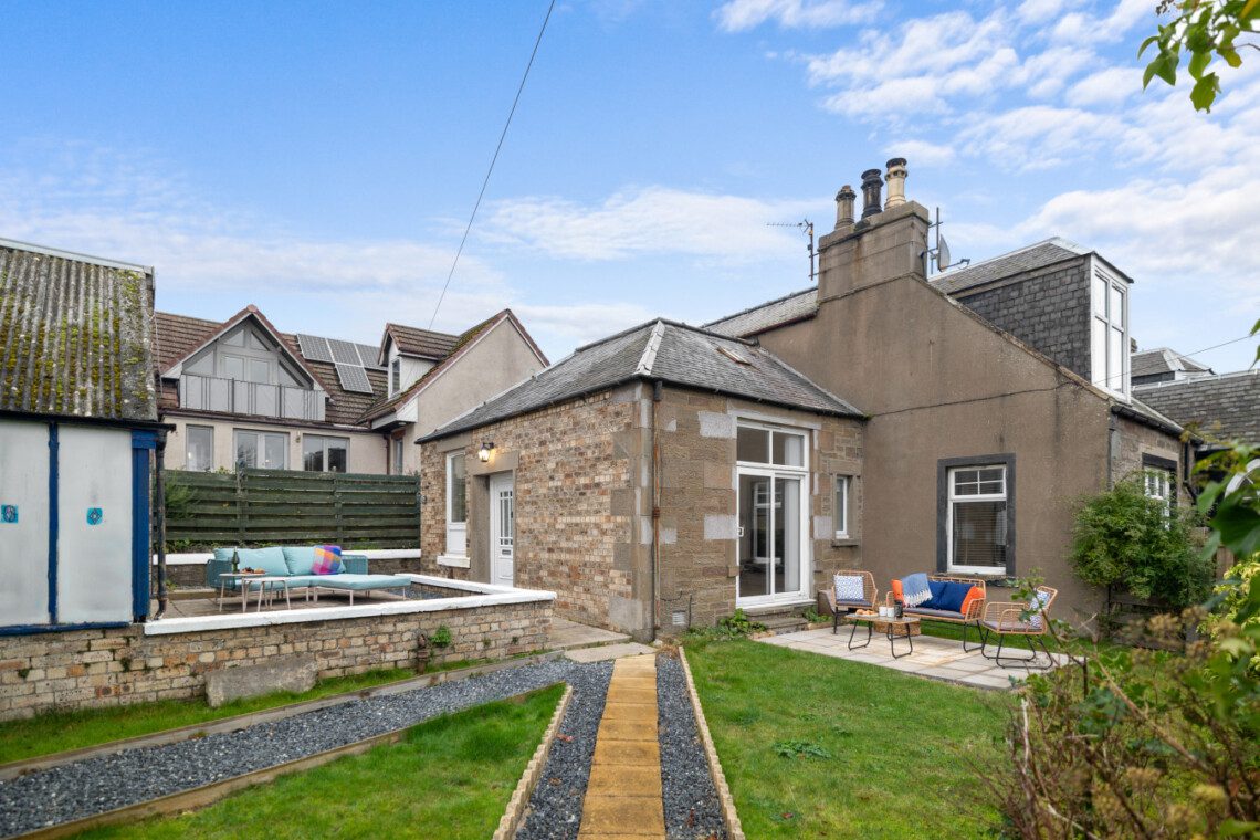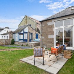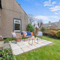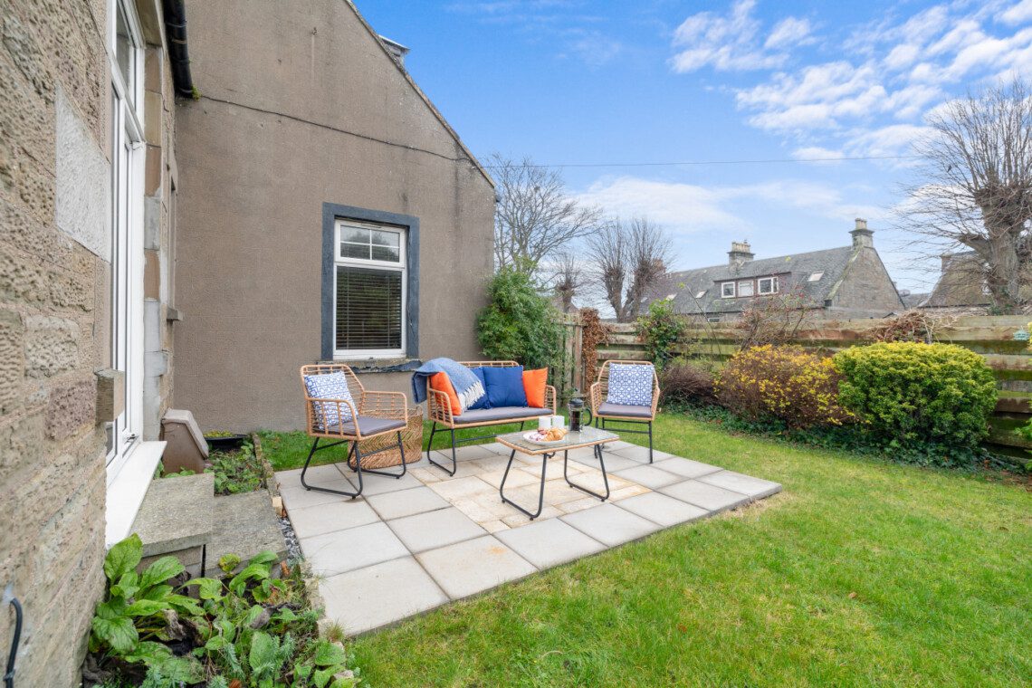 Large French doors open directly from the living space onto the garden, creating a lovely indoor–outdoor flow. When the weather is warm, this becomes one of the property’s best features. Outside, you’ll find garden furniture that makes it easy to enjoy al fresco breakfasts in the sunshine or unwind with a drink at the end of the day. In the summer months, this space truly comes into its own – private, inviting, and perfect for soaking up Carnoustie’s fresh coastal air.