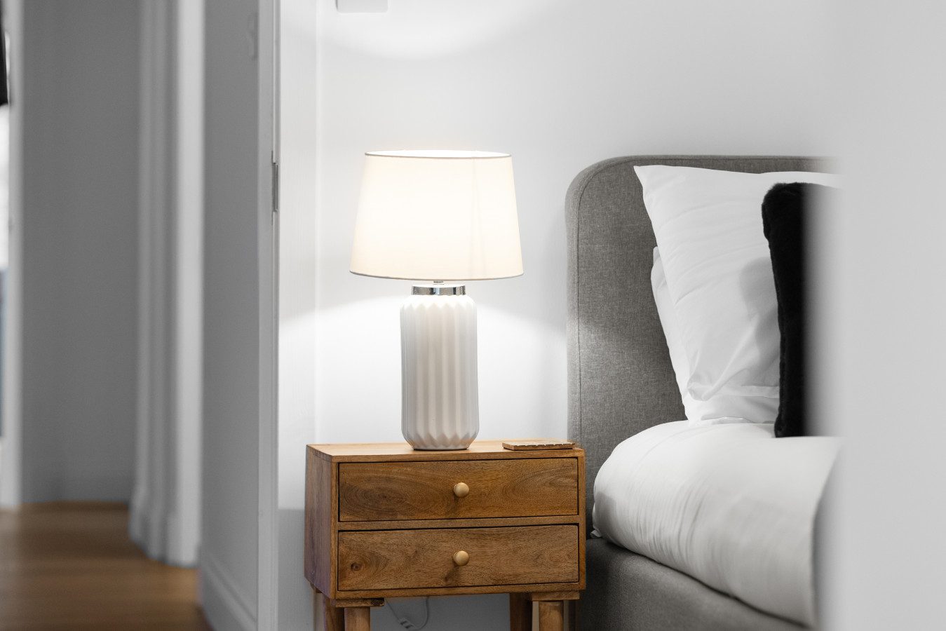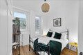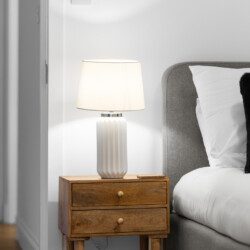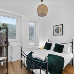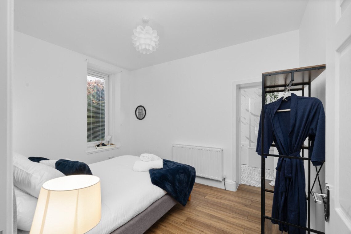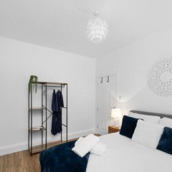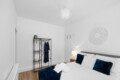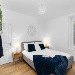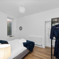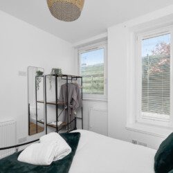 The second bedroom includes a double bed and further storage, offering a restful space for additional guests, children, or colleagues travelling together. Each room carries the same clean, stylish aesthetic that runs throughout the property, with thoughtful touches and a focus on comfort.