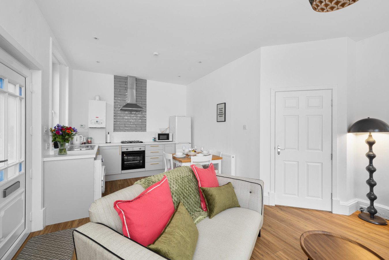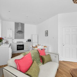 Inside, every detail has been considered to create a warm, stylish space that feels instantly relaxing. The heart of the home is the open-plan kitchen, dining, and living area – bright, beautifully finished, and designed for slow mornings or cosy evenings in. The kitchen is fully equipped with modern appliances and all the essentials you need for cooking during your stay. A dining table provides seating for relaxed meals or a comfortable spot to work if you’re travelling for business.
