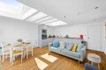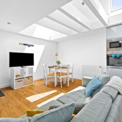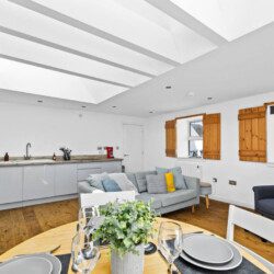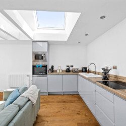 The modern kitchen is fully equipped with everything you need for relaxed cooking, and the spacious dining area – set beneath a skylight – is the perfect spot for long, leisurely meals.