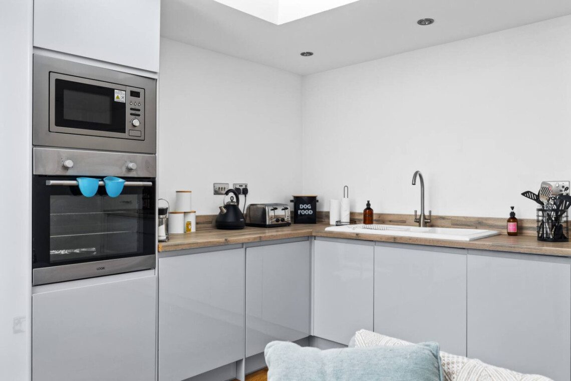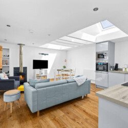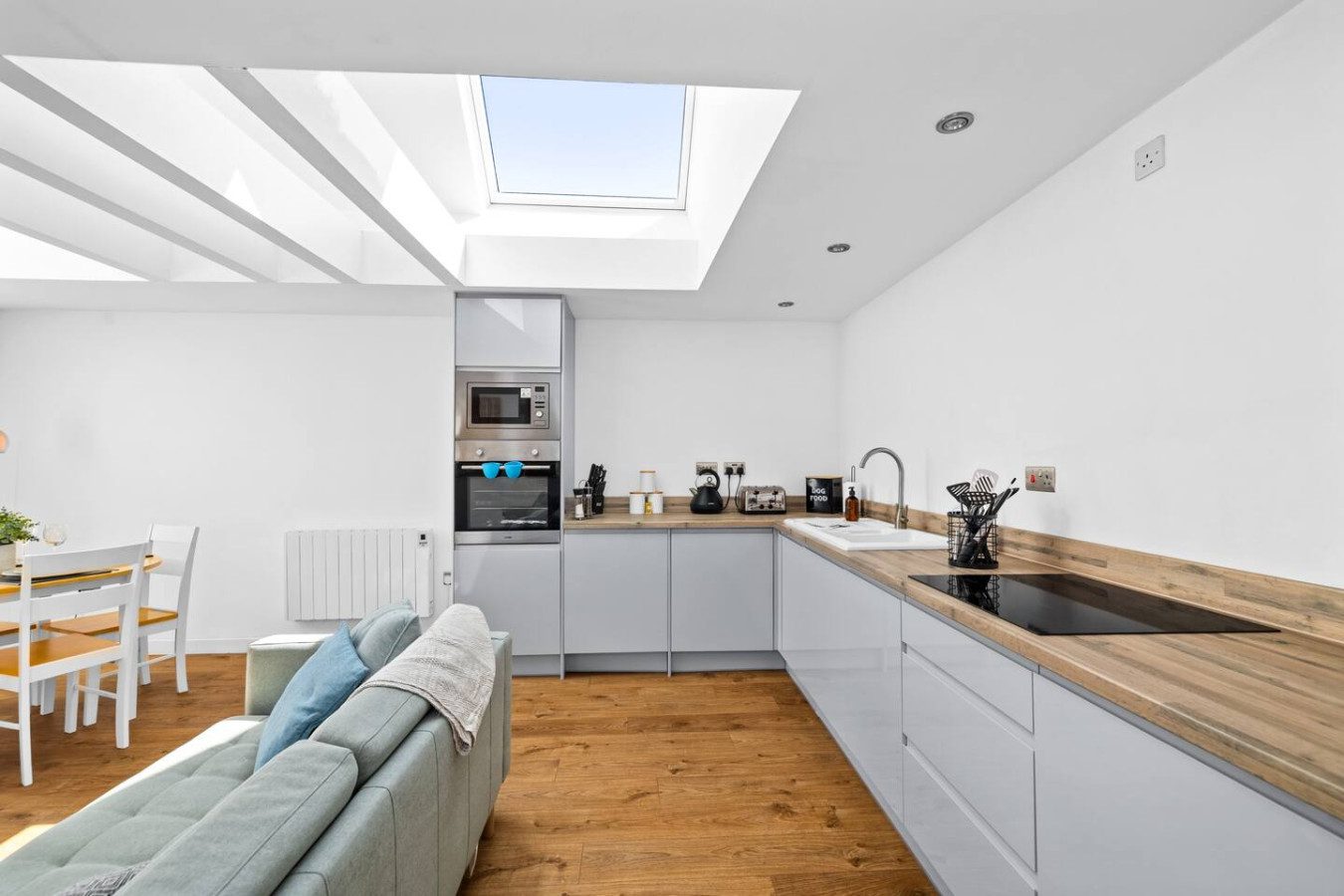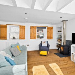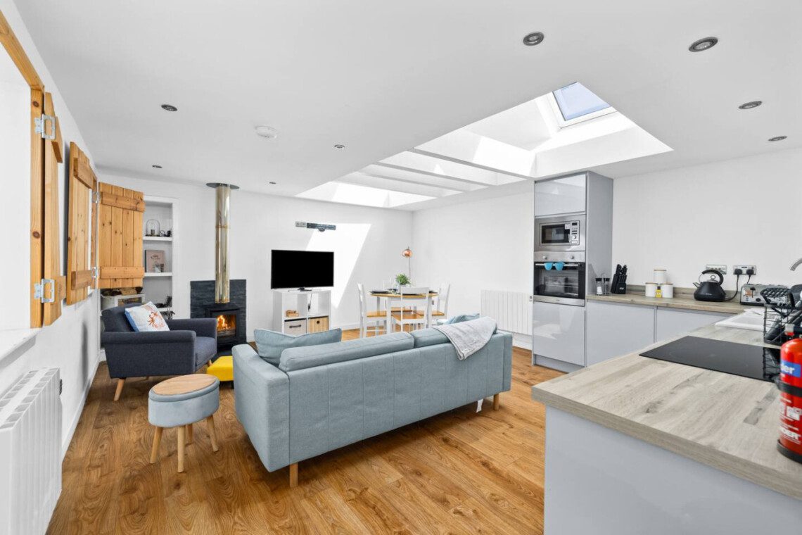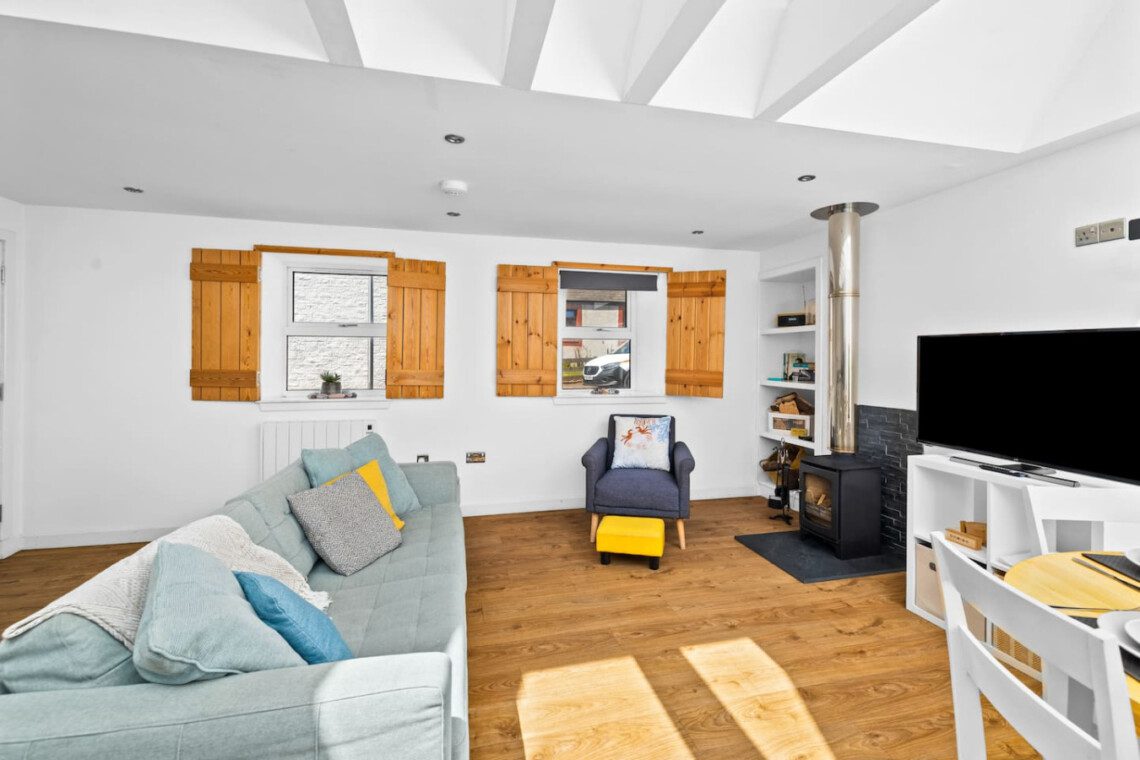 Inside, everything is thoughtfully laid out across a single level. At the heart of the cottage is an impressive open-plan living space, where a semi-vaulted ceiling with exposed beams and two large VELUX windows flood the room with natural light, even on grey days. A freestanding wood-burning stove adds cosy warmth, while a Samsung Frame TV offers stylish, high-quality entertainment.