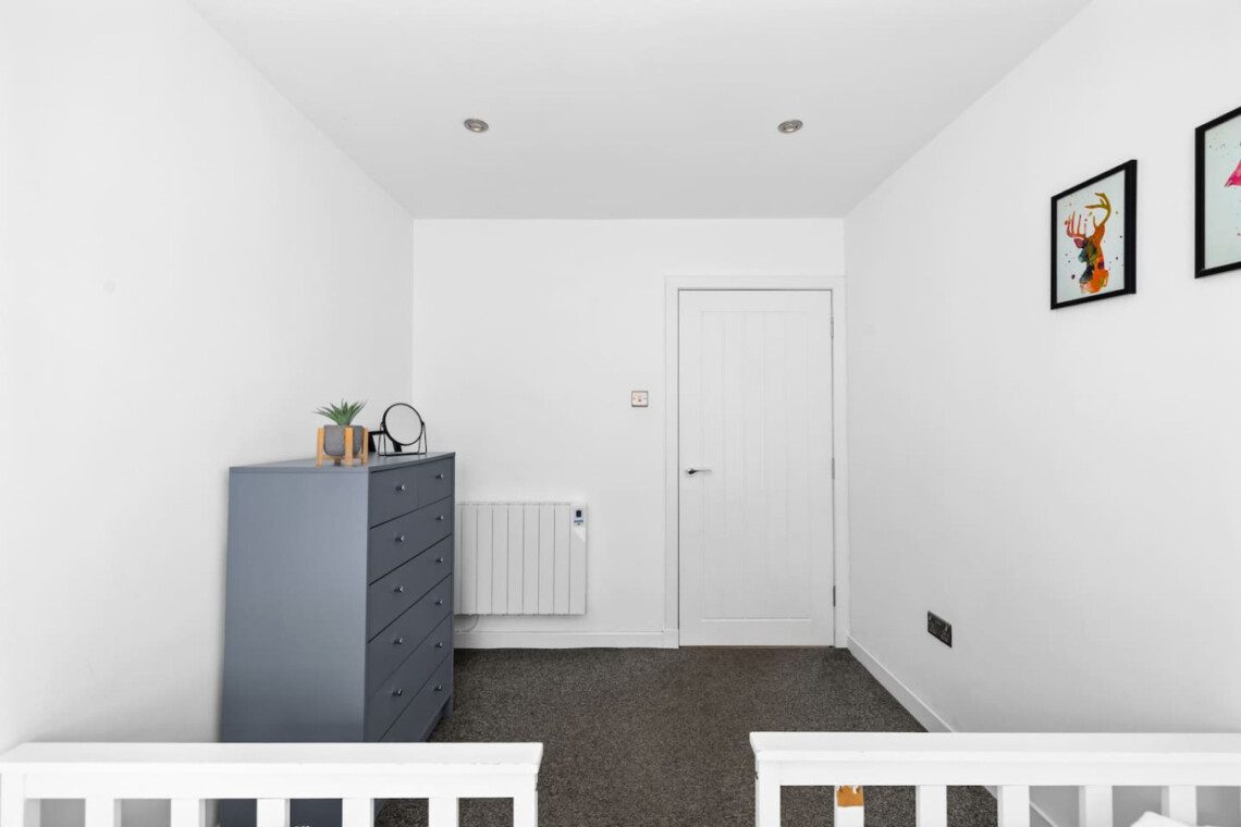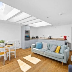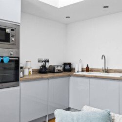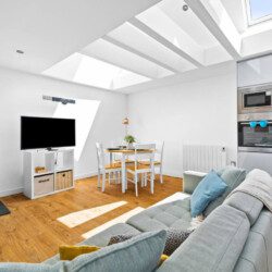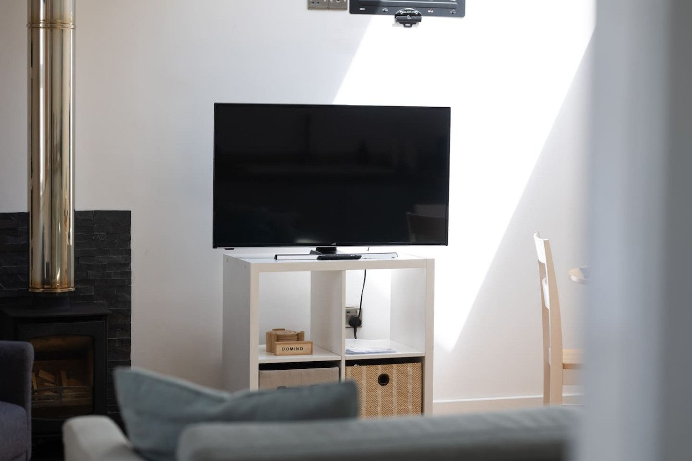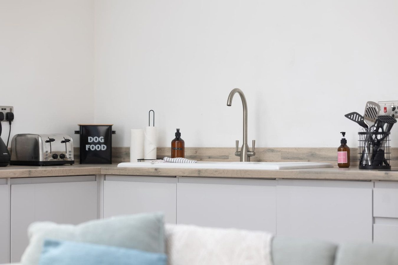 Inside, everything is thoughtfully laid out across a single level. At the heart of the cottage is an impressive open-plan living space, where a semi-vaulted ceiling with exposed beams and two large VELUX windows flood the room with natural light, even on grey days. A freestanding wood-burning stove adds cosy warmth, while a Samsung Frame TV offers stylish, high-quality entertainment.