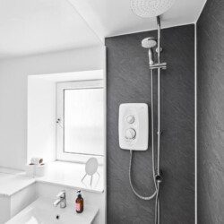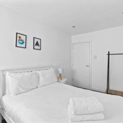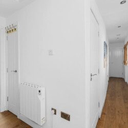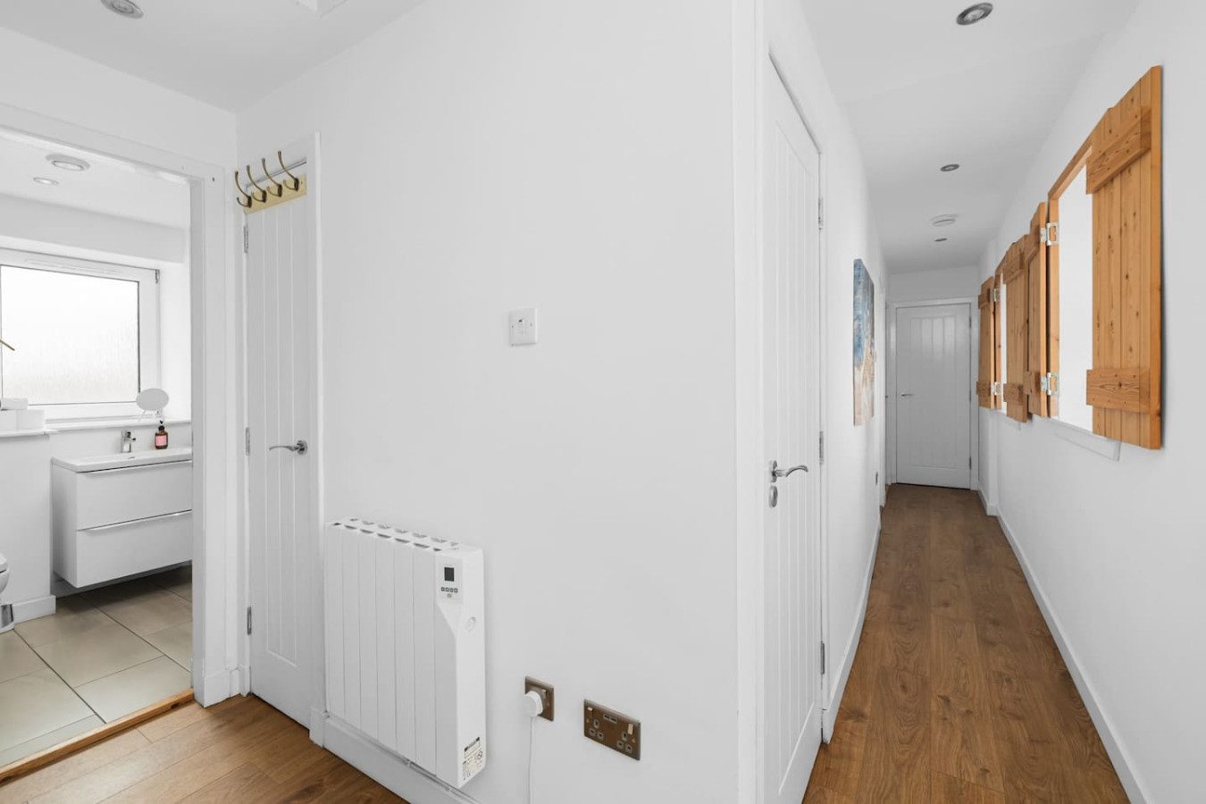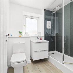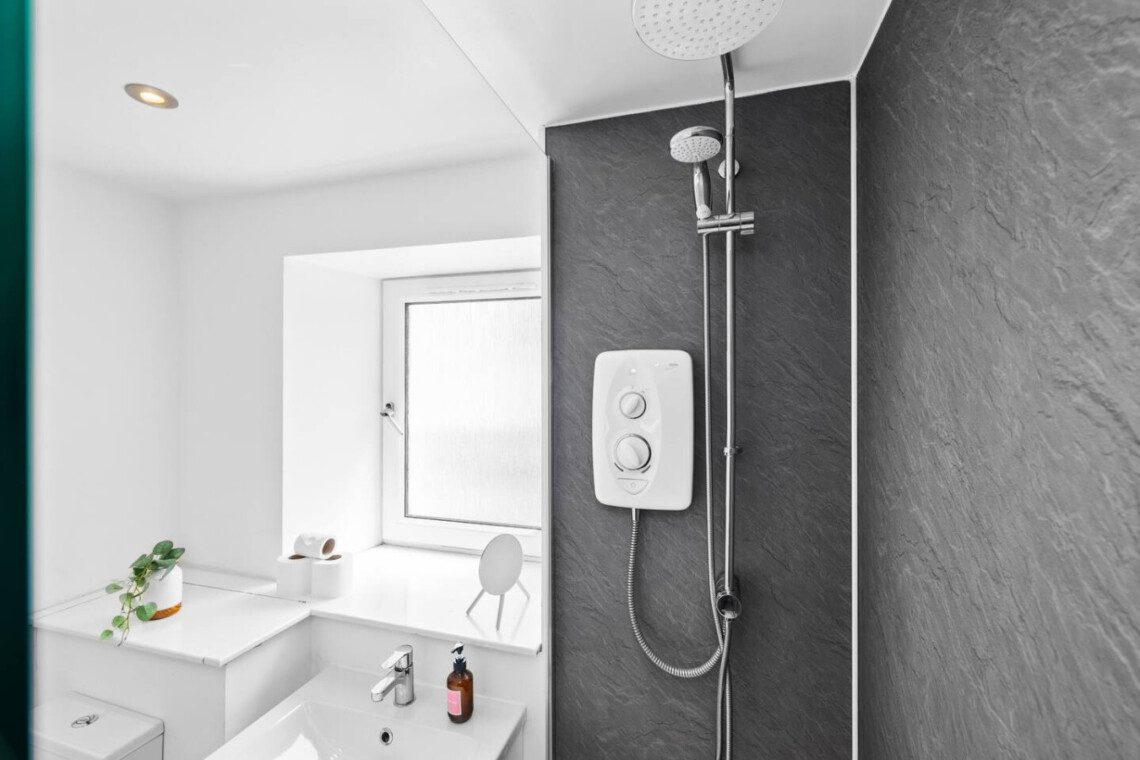 The cottage features two bedrooms – one double and one twin – both offering partial sea views over neighboring rooftops. The shower room is equipped with a walk-in enclosure featuring a rainfall shower head, ideal for rinsing off after beach adventures, with underfloor heating providing comfort during colder months.