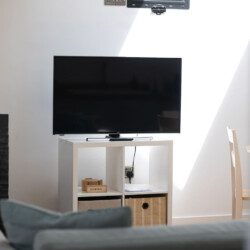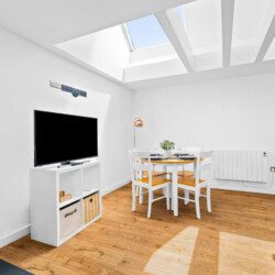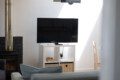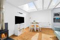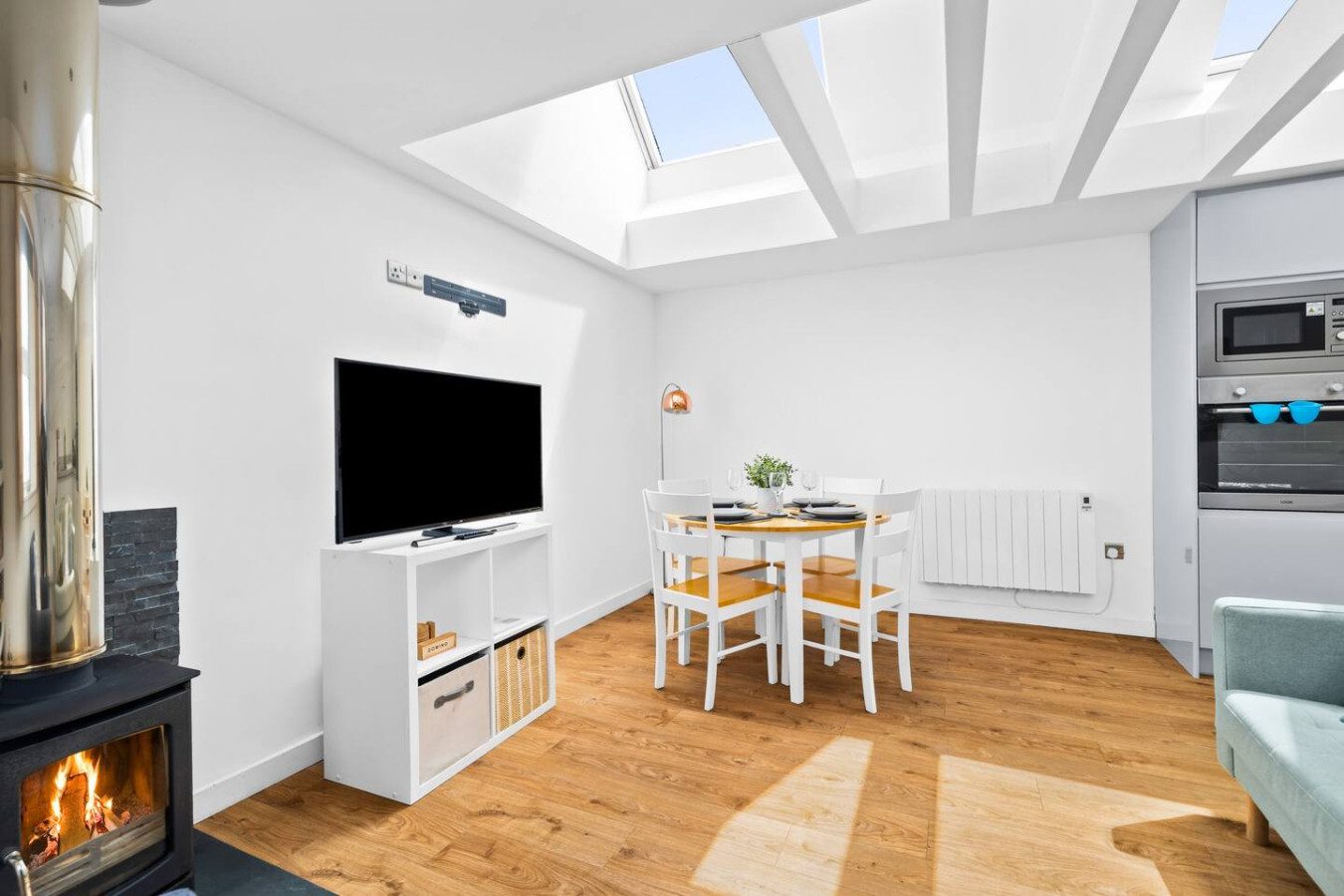 A freestanding wood-burning stove adds warmth and ambiance, while a generously sized dining table beneath one of the roof windows offers a delightful setting for meals. For entertainment, a high-end Samsung Frame TV adorns the wall.