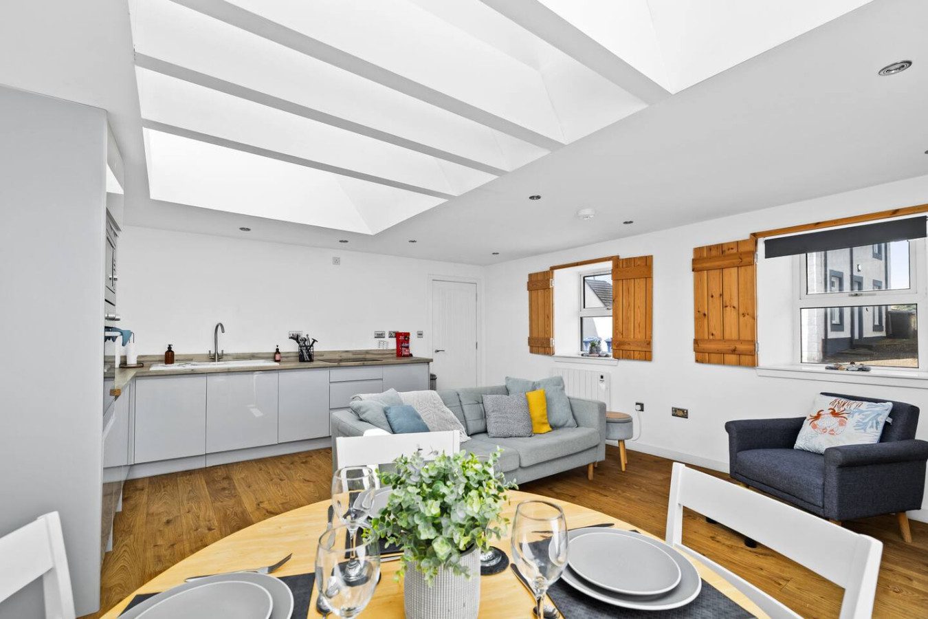 Inside, the accommodation is conveniently laid out on a single level, with the highlight being the impressive open-plan living area and kitchen. The space boasts a semi-vaulted ceiling reaching full roof height, adorned with exposed beams and two expansive VELUX windows, ensuring ample natural light even on overcast days.