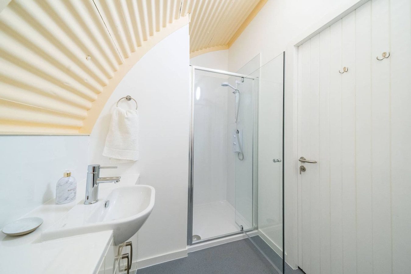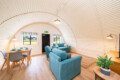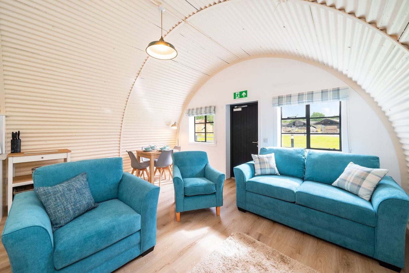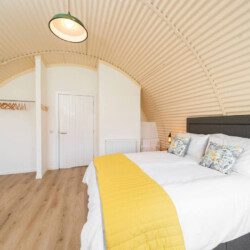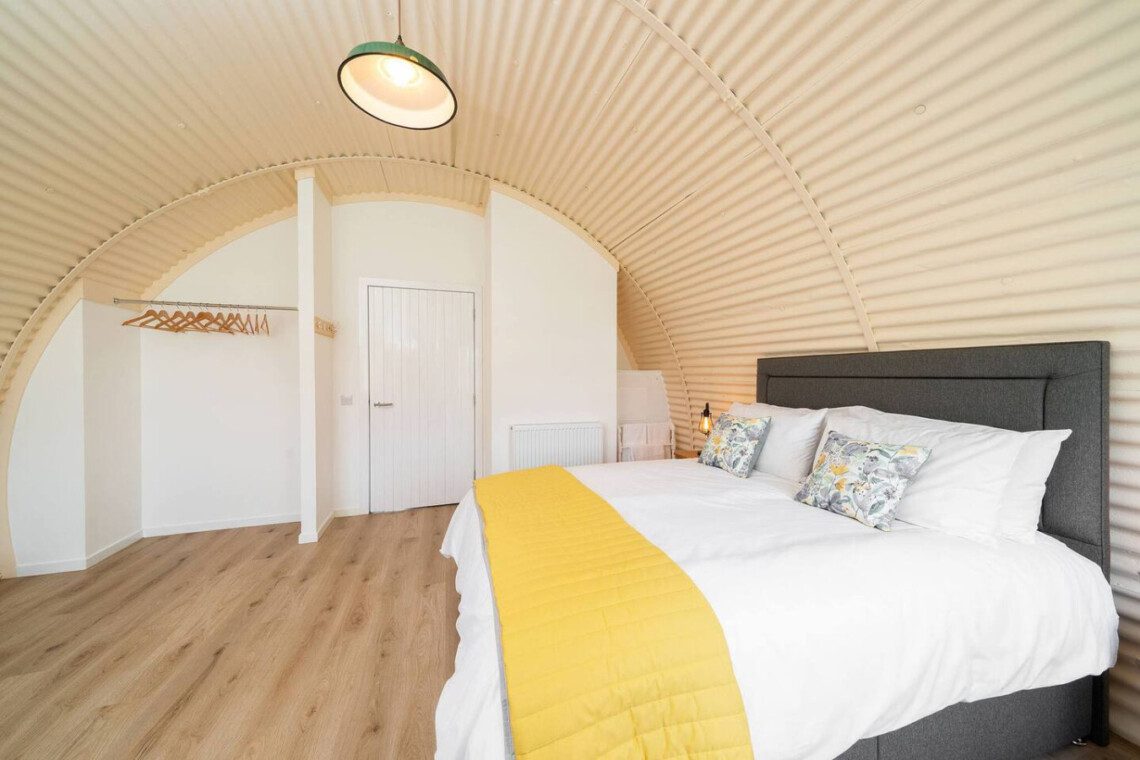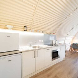 Every building tells a story and this one certainly has a rich history! Hut 35 is one of five beautifully modernised and renovated Nissen huts that are part of the former Cultybraggan Prisoner of War Camp, just a mile outside the picturesque village of Comrie.Nissen huts were commonly used in PoW camps across Britain during World War Ii. While they were only intended to be temporary, Cultybraggan Camp lived on after the war as a Mod training centre for more than 70 years. It’s now the last remaining Prisoner of War Camp in Scotland and has been named by Historic Scotland as a Unique Heritage Asset of International Value.Thanks to the vision of the Comrie Development Trust, which now owns the camp, five Nissen huts have been transformed into spacious, sustainable and modern self-catering accommodation. They’re ideal whether you’re a keen history buff or simply want a truly unique stay in the Perthshire countryside.While the huts retain their iconic external design, they’ve all been given a major facelift with a bright red roof, crisp white exterior front wall, and black door and window trim, providing an Insta-worthy contrast to the vivid greens of the surrounding Aberuchill Hills. Inside, Hut 35 has been completely transformed with a spacious open plan living room, fully-equipped kitchen and dining space, full of natural light. Blond wooden floors, cream interior walls, pale furniture tones and the white cabinetry of the kitchen add to the sense of space and calm. There’s comfortable seating including a sofa bed and television for when it’s time to relax, plus a dining table with seating for 4.The separate bedroom contains a king size bed, and there’s also a modern separate bathroom with a shower.Key Features Fully modernised, renovated huts1 bedroom – 1 x King & 1 x Double Sofa Bed 1 modern main shower room.Open plan kitchen and lounge areaDining table that seats 4Fully equipped Kitchen Situated within the former prison of war camp.LocationCultybraggan Camp is situated two miles outside the picturesque village of Comrie, in the heart of Perthshire. The Camp, which belongs to the Comrie Development Trust, is home to local businesses and community groups. You can learn about the history of the camp at the informative PoW exhibition, which includes a recreation of prisoner accommodation.Take a visit to Comrie village where you’ll find local shops and places to eat, with more options a little further along in the larger town of Crieff.Comrie is a great base for exploring all the delights of Perthshire. Families will love a trip to Auchingarrich Wildlife Centre, set in the Perthshire hills, home to a variety of exotic and more familiar wildlife. Golfers are spoilt for choice with lots of quality local courses, or the famous Gleneagles is just half an hour’s drive away. It’s a walker’s paradise with options at all levels, from the Glenlendock Circular Walk that starts in Comrie, the popular and wheelchair-friendly Lady Mary’s Walk at Crieff, to the mighty Munros of Ben Vorlich, Stuc a Chorin and Ben Chonzie.Welcome to Cultybraggan Camp, enjoy this unique stay!Just a quick heads-up: there’s a cattle grid at the entrance of the camp. Since we’ve got a bunch of small business outlets here, you might spot some vehicles coming and going in the early mornings and late evenings.