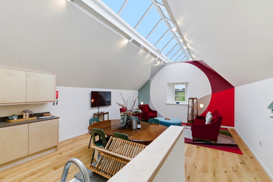 A striking countryside retreat at Papple Steading, The Granary sleeps up to 6 guests and combines dramatic vaulted living space, bold contemporary interiors and a calm rural setting in the heart of East Lothian. With a large open plan kitchen, dining and lounge area, beautifully finished bedrooms, modern bathrooms and access to Papple’s wider grounds and shared amenities, it is ideal for families, friends and small groups looking for a stylish escape.