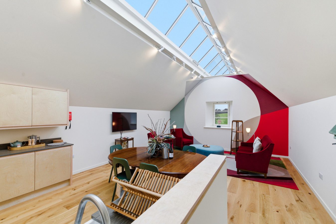 At the heart of The Granary is a stunning open plan kitchen, dining and living space with a vaulted ceiling and a large rooflight running overhead, flooding the room with natural light. The effect is bright, airy and immediately impressive, giving the main living area a real sense of scale. Clean modern lines are balanced with warm timber tones, soft textures and bold accents, creating a space that feels polished but never cold.